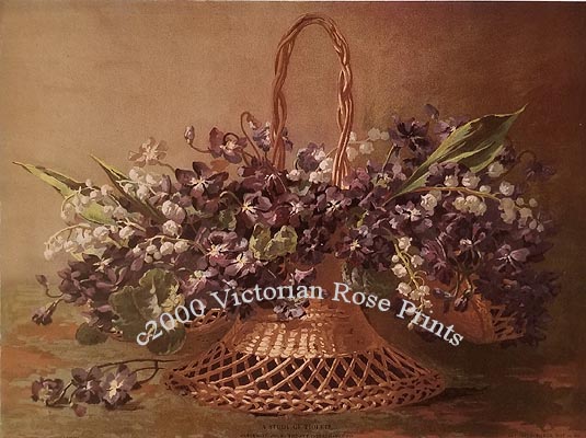 This sweet freshly-gathered bouquet of French violets and lily of the valley is taken from the works of the Victorian artist Catherine Klein. It is an unsigned print and the details are superb. In Victorian times, the little violet stood for the virtues of Modesty and Faithfulness, while the lily of the valley symbolized the Return of Happiness. Please note, the lily of the valley is a bit whiter in coloring than shown. . Overall size is aprox 10.5 x 14 inches, printed on heavy stock, and can fit into a standard size 11 x 14 inch frame.