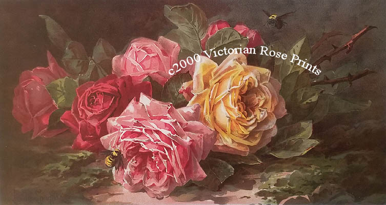 This lovely example of a freshly-gathered cabbage roses bouquet attended by bumblebees is taken from the works of the Victorian artist Paul de Longpre. The details are superb. In Victorian times, the pink rose symbolized that the bearer was An Ambassador of Love. Overall size is 8.75 x 16.5 inches, printed on heavy stock.